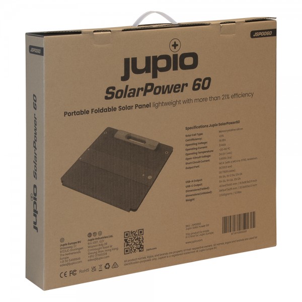 Panneau solaire puissance de sortie maximale 60 Watt avec une efficacité de conversion de ≥21%. 2 ports USB-A et USB-C intégrés.