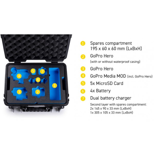 Grâce à son insert en mousse personnalisée, il offre suffisamment d'espace pour la GoPro Hero 9/10/11/12/13 et les accessoires : le double chargeur de batterie, jusqu'à 3 batteries, jusqu'à 7 microSD, des supports de montage et des câbles.