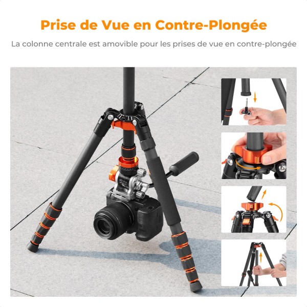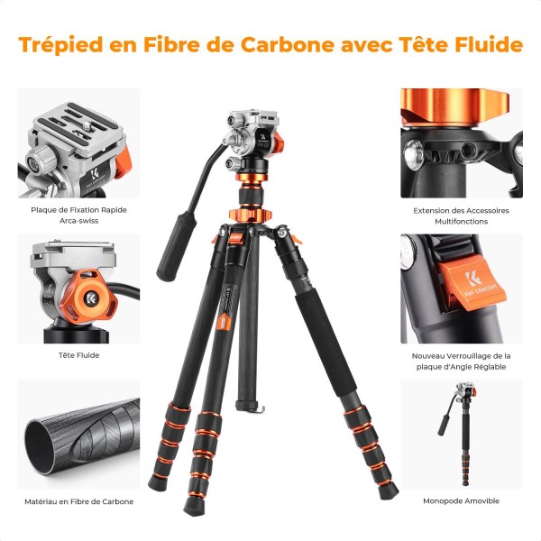 Trepied en fibre de carbone assurant stabilité et est également très léger (1,1 kg pour le cadre, 1,64 kg avec la rotule).